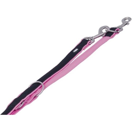 Vodítko je vyrobené z odolného černého nylonu se vzorem síťky podšitého barevným neoprenem. Měkká rukojeť zajišťuje pohodlný úchop. Karabiny a přepínací kroužky jsou z matného kovu stříbrné barvy. Přepínací vodítko lze nastavit na 3 různé délky a celkově měří 2 metry. Hmotnost (cca): 238 g Materiál: nylon, neopren, kov. Velikost: M–L Rozměry (cca): délka 200 cm, šířka 2–2,5 cm Barva: černá, růžová