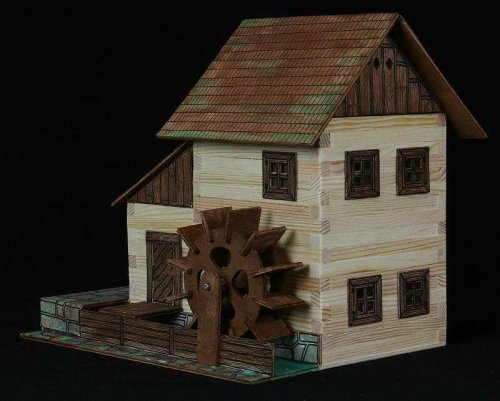 Dřevěná slepovací stavebnice Walachia - Vodní mlýn. Slepovací stavebnice Walachia jsou dřevěné modely domečků a staveb z Valašského kraje v měřítku 1:32. Základem jsou dřevěné hranolky 9x9 mm a k tomu jsou v sadě vždy všechny papírové doplňky - okna, dveře, střešní části atd. Pro lepení se používá lepidlo Herkules, není však součástí stavebnice. Přiložený je montážní návod a malé kapitoly z historie lidové architektury. Níže je označení obtížnosti číslem 1 - 5, přičemž 1 je nejlehčí. Rozměry: 24 x 18 x 22 cm. Počet dílů stavebnice: 196. Obtížnost: 5