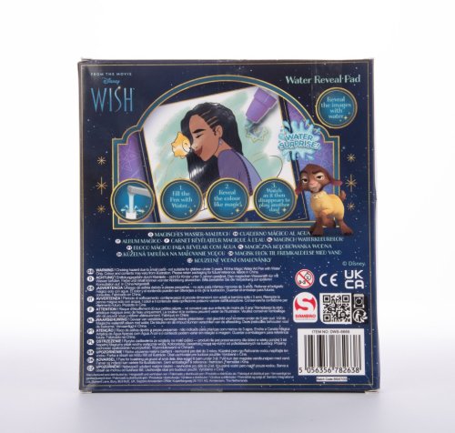 Magické vodní omalovánky Disney Wish – součástí balení pero na vodu. Naplňte pero čistou vodou, přetřete obrázek vodou a dívejte se, jak se obrázek zabarvuje. Po uschnutí barva z obrázku zmiží a vy můžete obrázek vybarvovat znova a znova.