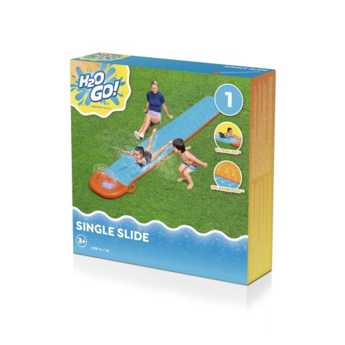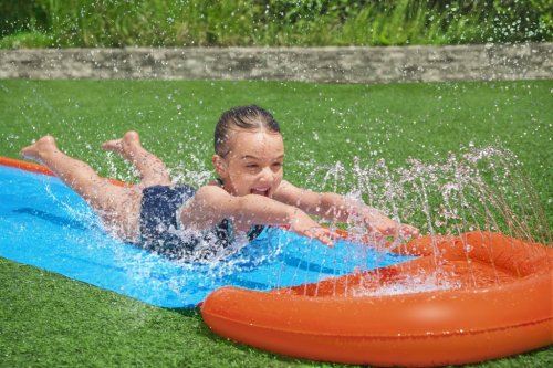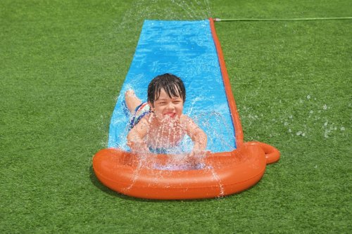 S touto parádní skluzavkou zažiješ tu pravou letní zábavu. Vyrobeno z testovaného masivního vinylu. Přibližná velikost je 488 cm. Skluzavku zapoj do zahradní hadice a užij si spoustu zábavy. Zabudovaná sprška v přední části skluzavky. Opravná záplata součástí balení.