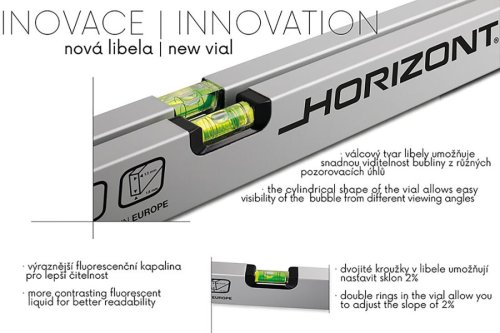 Horizont vodováha se dvěma libelami, přesnost 0,5mm/m = 0,0285°, eloxovaný otěruvzdorný povrch, tloušťka stěny ALU profilu 1,5mm, kapalina v libelách je UV stabilizovaná a fluorescenční, horizontální optická libela - usnadňuje a zvyšuje přesnost měření, vodováha je odolná proti provozním nárazům, 10 let záruka na libely, KAŽDÝ KUS ELEKTRONICKY TESTOVÁN.