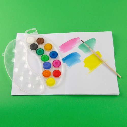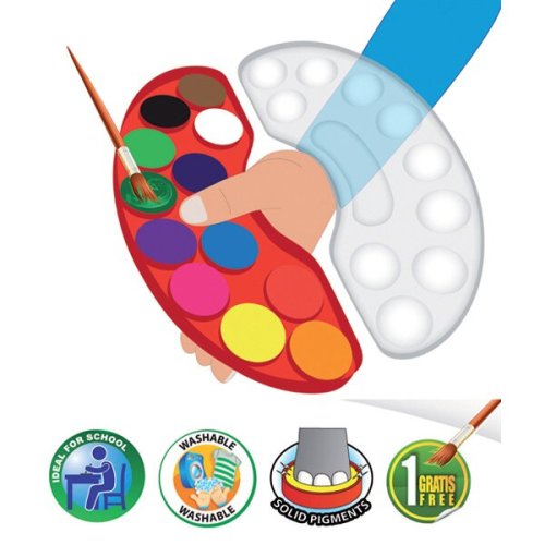 snadno mísitelné barvy s pevnou strukturou, * unikátní design – obal lze uchopit jako malířskou paletu a plocha víčka umožňuje míchání jednotlivých barev, * snadno omyvatelné a vypratelné z většiny běžných textilií včetně praktického omyvatelného obalu, * dodáváno včetně štětce, 12 BAREV, Ø 25 MM, TIP: K vodovým barvám můžete potřebovat i papír, štětce nebo kelímky na vodu.