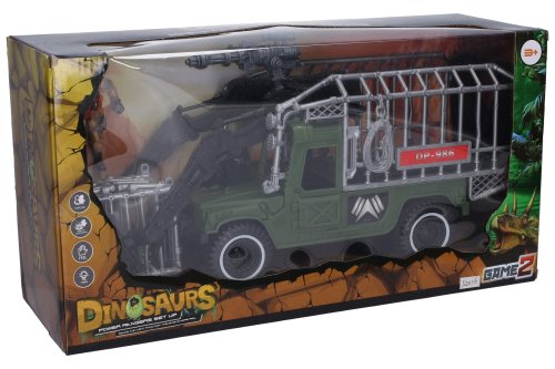 Voják Lovec dinosaurů set s nákladním autem. Obsah balení - přepravní auto s klecí (volná kola, v přední části je podavač lapených dinosaurů, rozměry 40x13x17 cm), figurka lovec 11 cm, 5x figurka dinosaura 5 cm.