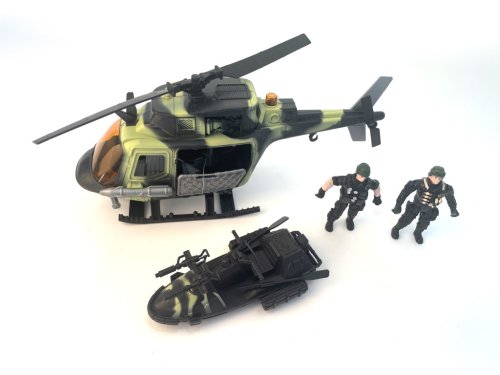 Vojenská helikoptéra s úložným prostorem. Součástí balení jsou 2 figurky.