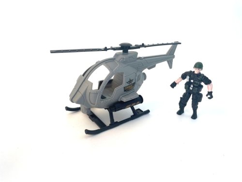 Vojenská helikoptéra s figurkou vojáčka a doplňky.