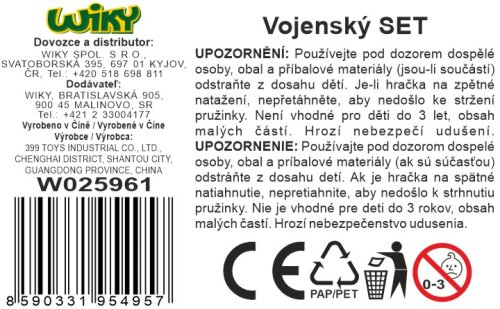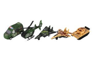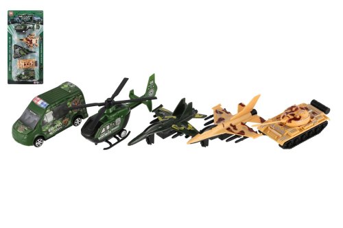 Vojenský set. Na zpětné natažení a volná kola. Velikost vrtulníku 16,5 cm. Součástí vrtulník, 2 stíhačky, tank, auto.