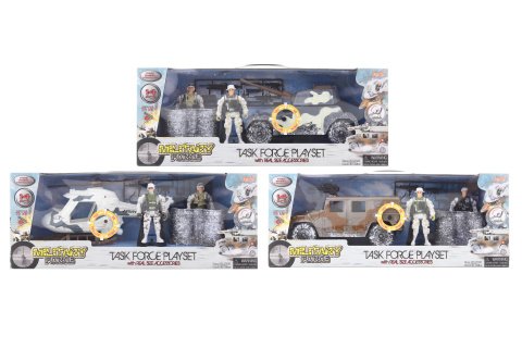 Vojenská sada na baterie. Balení obsahuje helikoptéru, auto nebo dělo (dle druhu), 2 vojáky, úkryt a zbraně. Helikoptéra, auto nebo dělo (dle druhu) vydává zvuky a svítí. Napájení na 2 AG13 baterie (jsou součástí). Rozměry balení cca 39,5 x 15,5 x 10,5 cm. Věk 3+