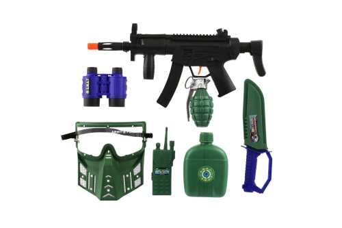Připrav se na akci! Tato vojenská sada obsahuje plastový klapací samopal o délce 32 cm a tematické doplňky pro malé vojáky. Ideální pro akční hry, které podporují představivost, pohyb a dobrodružného ducha. Vše prakticky baleno v síťce. Délka samopalu: cca 32 cm Vhodné pro děti od 3 let