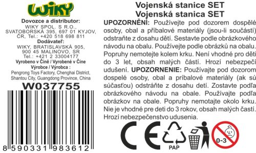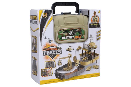Vojenská stanice se 2 auty v batohu. Stanice obsahuje dráhu, výtah, jeřáb, heliport, 2 auta. Batoh obsahuje popruhy. Obrázkový návod na sestavení na zadní straně obalu.