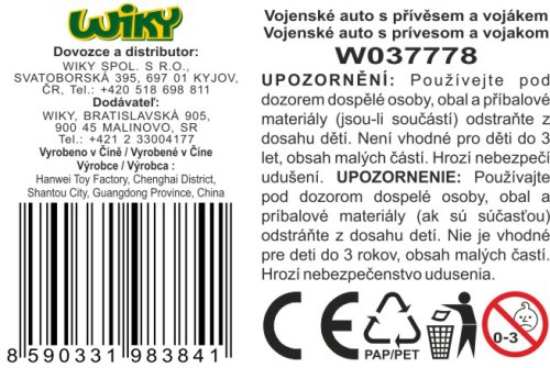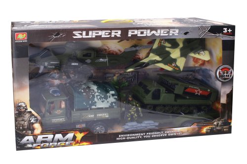 Vojenské auto konvoj s přívěsem 63cm a vojákem. Velikost auta s přívěsem 63cm. Obsahuje auto, přívěs, raketomet, stíhačku, vrtulník, figurku vojáka, doplňky.