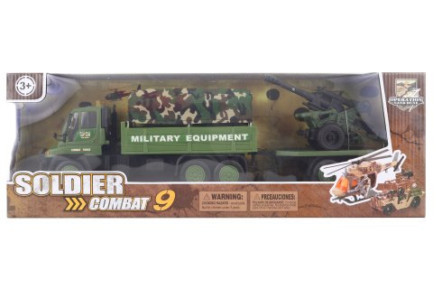 Vojenský kamion s plachtou a přívěsným vozíkem s kulometem. Rozměr auta cca 29 x 13 cm. Rozměr kulometu cca 18 x 10 cm. Rozmě balení cca 52 x 18 x 11,5 cm. Věk 3+