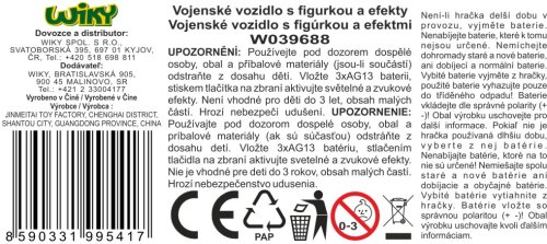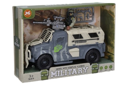 Vojenské vozidlo s figurkou a efekty. Velikost vozidla 24 cm, figurky 10 cm. Volná kola. Světelné a zvukové efekty tlačítkem na zbrani. 3xAG13 baterie součástí. Obsah vozidlo, voják, zbraně.