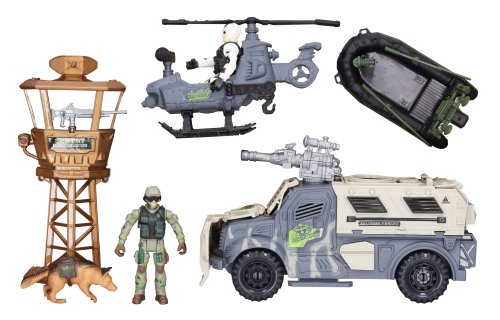 Vojenský set s figurkami a efekty. Velikost vozidla 25 cm, vojáka 10 cm. Volná kola. Světelné a zvukové efekty tlačítkem na zbrani na vozidle. 3xAG13 baterie do zbraně na vozidle. Obsah - vozidlo, vrtulník, člun, věž, zbraně, pes, 2 figurky vojáků.