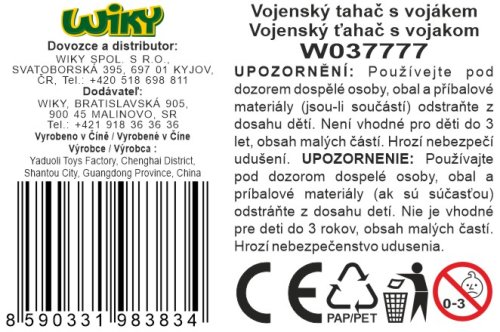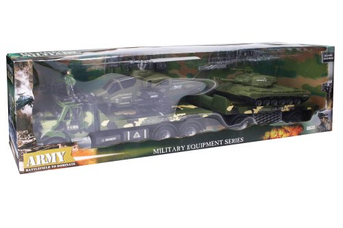 Vojenský tahač s vojákem. Velikost tahače 80cm. Obsahuje tahač, vrtulník, tank, figurku vojáka, příslušenství pro vojáka.