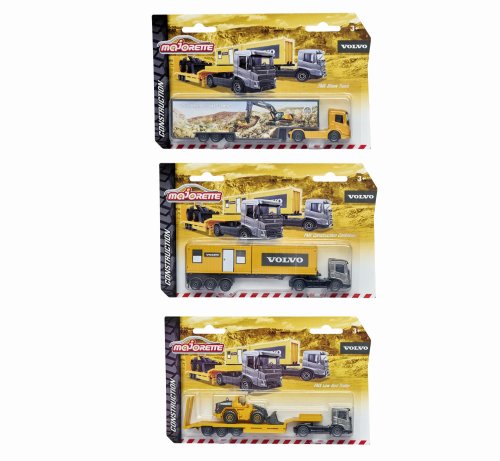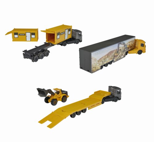Kovový nákladní automobil Volvo – Transportér s přívěsem a kolovým nakladačem, se 2 stavebními kontejnery nebo kamion s odpojitelným přívěsem. Díky robustnímu kovovému podvozku a vysoce kvalitnímu provedení je každé vozidlo vyrobeno tak, aby vydrželo. Délka 20 cm.