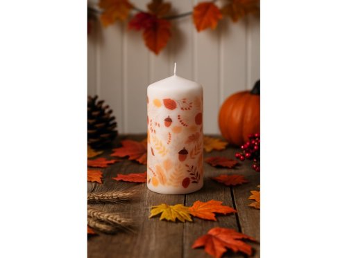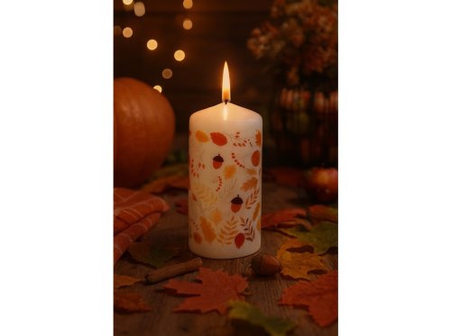 Klasická válcová svíčka s jemnou podzimní vůní a potiskem listí. Skvěle doplní sezónní dekorace a navodí hřejivou atmosféru. Výška 12 cm, průměr 6 cm.