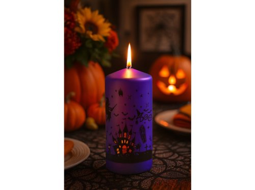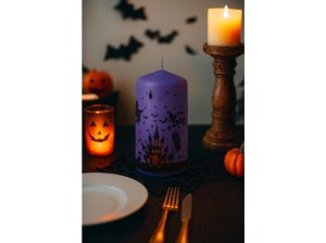 Originální fialová válcová svíčka s halloweenským nápisem „Boo“. Výborná pro výzdobu domácnosti během svátků duchů. Hodí se k dalším doplňkům v tmavých tónech.
