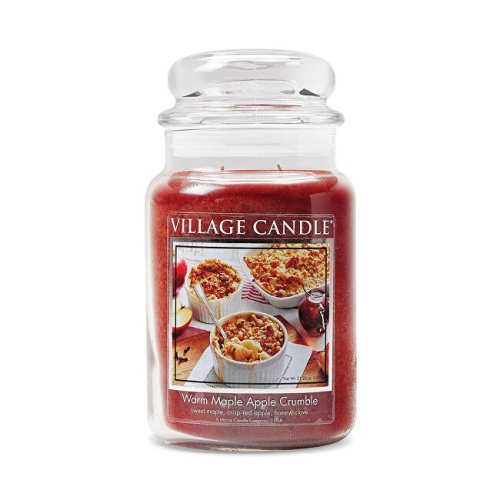 Dekorativní vonná svíčka ve skleněné dóze s víčkem a dvěma knoty s vůní čerstvě upečeného jablečného koláče s máslem a skořicí, zalitého javorovým sirupem.