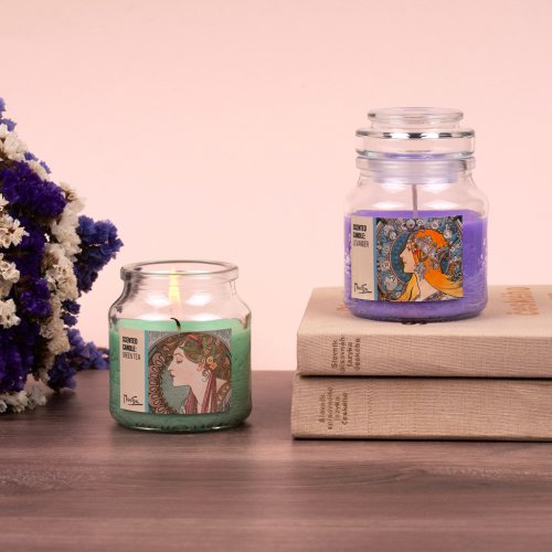 Vonná svíčka ve skleněném pouzdře se skleněným víčkem pro použití v interiéru.