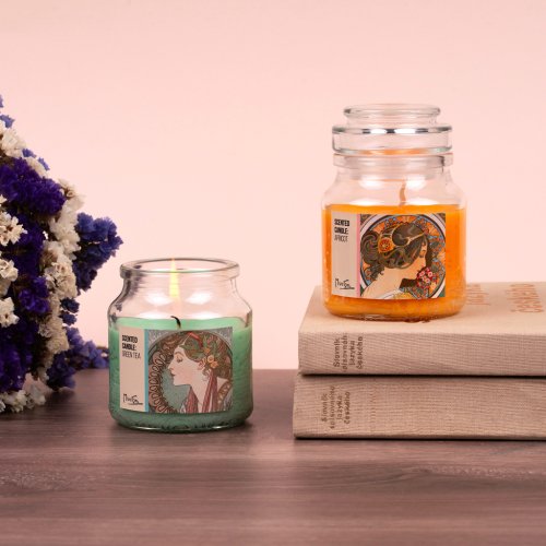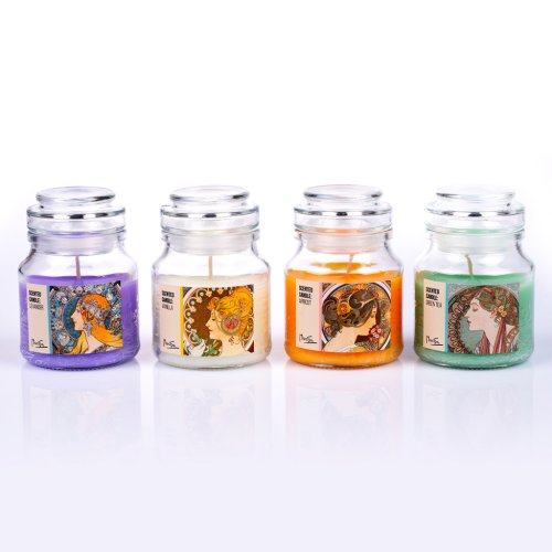 Vonná svíčka ve skleněném pouzdře se skleněným víčkem pro použití v interiéru.
