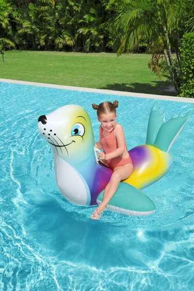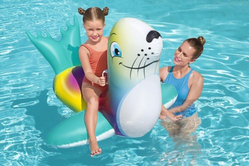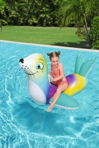 Nafukovací vozidlo ve tvaru tuleně je určeno pro zábavu dětí ve vodě a nabízí rozměry 157 × 114 cm, což poskytuje dostatek prostoru pro pohodlné sezení. Tento model je vyroben z pevného a odolného vinylu, který je zároveň příjemný na dotek a dostatečně odolný vůči mechanickému poškození během hry. Povrch hračky je barevně velmi atraktivní, kombinující jemné přechody barev od světle zelené přes žlutou a fialovou až po modrou, což dodává produktu hravý a veselý vzhled. Tuleň má charakteristický usměvavý výraz, velké oči a černý čumák, což přispívá k jeho přátelskému a vesele laděnému designu.