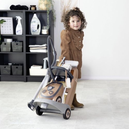 Úklidový vozík s vysavačem Rowenta s příslušenstvím. Dětský vysavač vydává skutečný zvuk vysavače. Díky kompaktní velikosti a nízké hmotnosti je snadno ovladatelný i pro menší děti od 3 let. Další příslušenství k úklidovému vozíku: lopatka a smeták, mop a makety obalů od čisticích prostředků atd. Tento výrobek obsahuje minimálně 71 % recyklovaného materiálu. Rozměry produktu (DxŠxV): 31 x 32 x 55 cm.