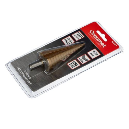 vrták stupňovitý HSS vyroben z vysoce kvalitní oceli M2 (HSS) kaleno na tvrdost 62 - 64 HRC určený pro vrtání slitin a ocelových a nerezových plátů do tloušťky 4 mm, plastu a dřeva na jednotlivých stupních …