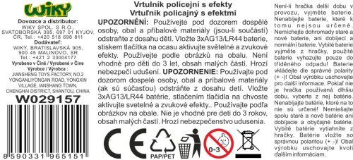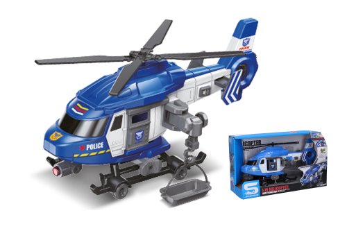 Vrtulník policejní s efekty. Rozměry 29x9,5x14 cm. Světelné a zvukové efekty tlačítkem na křídle. 3xAG13 baterie součástí. Stlačením páčky pod dveřmi se otáčí hlavní vrtule. Kolečkem na konci křídla se otáčí vrtule v křídle. Manuální navíjecí hák.