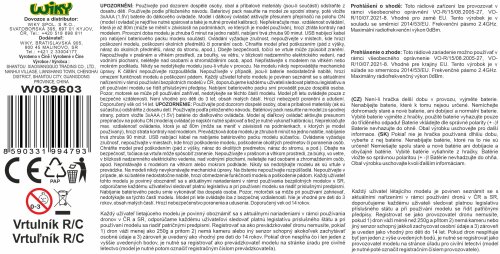 Vrtulník RC na dálkové ovládání. Bez kamery. Rozměry 18x17x6 cm. Frekvence 2.4GHz. 3.7V 500mAh bateriový pack do vrtulníku součástí, 3xAAA do ovladače nejsou součástí. USB kabel součástí. Provoz 6 min, nabíjení 90 min, dosah ovladače 80-100 m. Funkce - pohyb na místě, obrat o 360 stupňů, návrat do výchozí polohy. Tlačítko ON/OFF na vrtulníku a na ovladači.