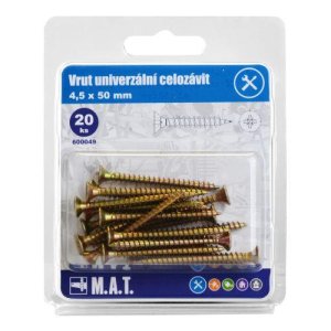 rozměry (pr. x D)): 4,5 x 50 mm materiál: Zn celozávit 20 ks Univerzální vrut je spojovací součástka s vnějším závitem, určená k vytváření rozebíratelných spojů především měkkých materiálů (dřevo, plast, …