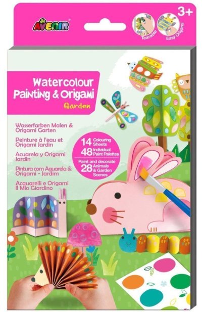 Origami a malování akvarelovými barvami. Obsahuje: 14 omalovánek, 48 barevných palet, štětec. Věk: 3+ VAROVÁNÍ! Nebezpečí udušení – malé detaily. Nevhodné pro děti do tří let.
