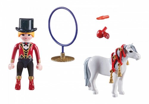 Jezdkyně trénuje se svým koněm už dlouho a dnes je velký den. Oblékla si své slavnostní oblečení s velkým cylindrem a vyčistila si boty. Také vykartáčovala a ozdobila hřívu svého poníka. Kruh je již v aréně. Udělá kůň odvážný skok? Rozměry: 12 x 9,3 x 3,8 cm. Věk: 4+