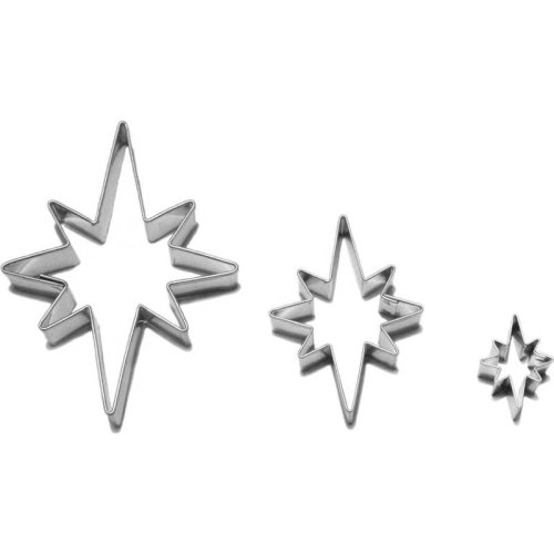 Osmícípé hvězdy s dlouhými ostrými paprsky, sada obsahuje tři kusy a poslouží jako samostatné cukroví, zákusky či je použijeme v kombinaci s dalšími sladkostmi. Ať už vykrajujete perník, těsto či fondán, tyto hvězdičky budou vždy velice efe.