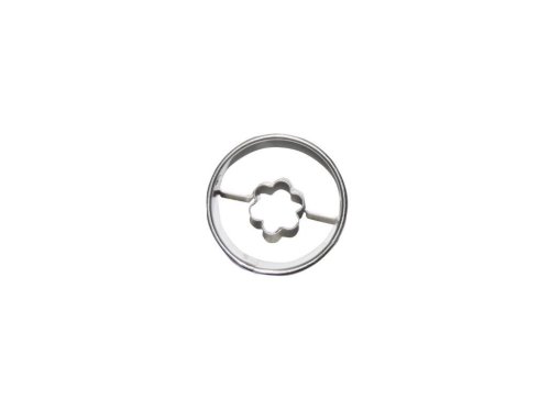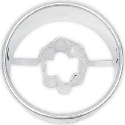 Vykrajovátko na cukroví ve tvaru kolečka průměrem 4 cm a květem uprostřed.
