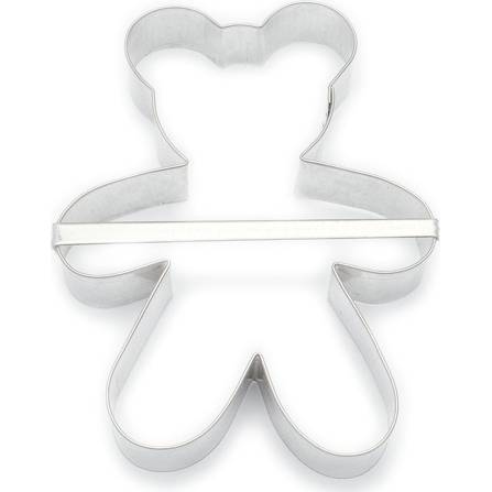 Vykrajovátko z pocínovaného plechu ve tvaru medvídka s rozměry 10 x 13,8 cm.