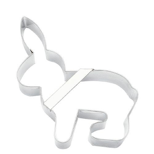 Vykrajovátko z pocínovaného plechu ve tvaru sedícího zajíčka má rozměr 10,5 x 12,5 cm.