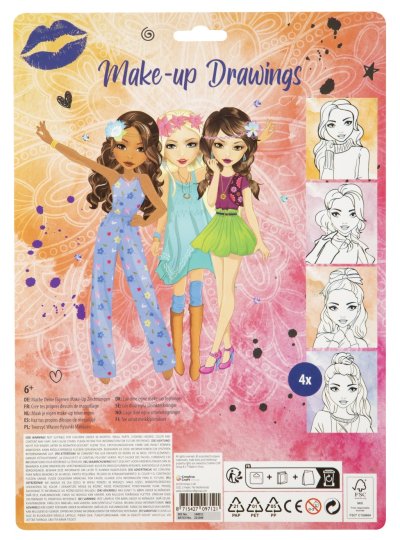 Obrázek – Make up pro panenky. Balení obsahuje 4 různé obrázky panenek, 4 pastelky a dvě sady s make-upem. Není určeno k líčení.
