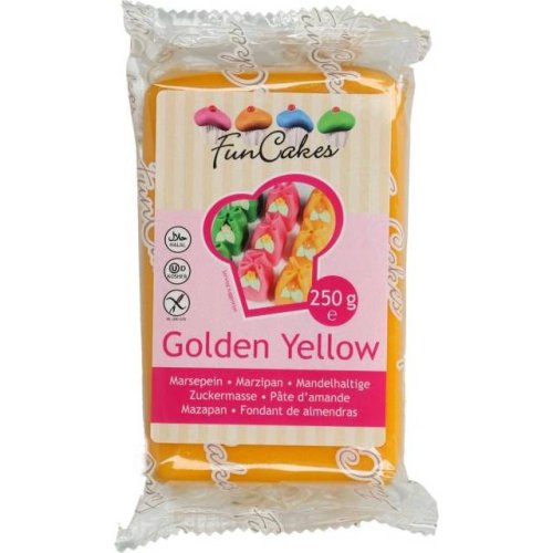 Marcipán ve zlato-žluté barvě z kvalitních surovin pro zdobení dortů a cukrářských dezertů. 250 g v balení.