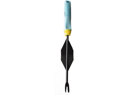 Zahradní vypichovač plevele s kolébkou, která slouží k lepší páce a manipulaci při zapíchnutí vypichovače do země.