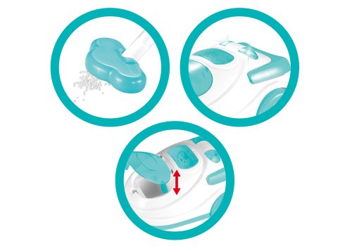 Vysavač s efekty. Velikost 22 cm. Vydává světelné a zvukové efekty. Balení obsahuje plastové kuličky k vysávání. Vysáté kuličky se ukládají v zásobníku v přední části vysavače, který je možné otevřít. 3xAA baterie (nejsou součástí).