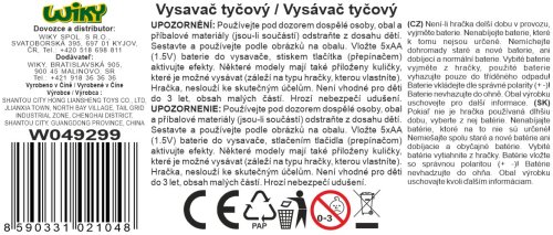 Vysavač tyčový. Rozměry 17x16x77cm. Baterie 5xAA nejsou součástí. Funkce vysávání. 3 různé nástavce.