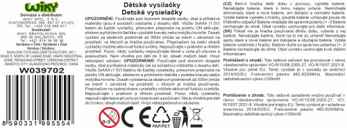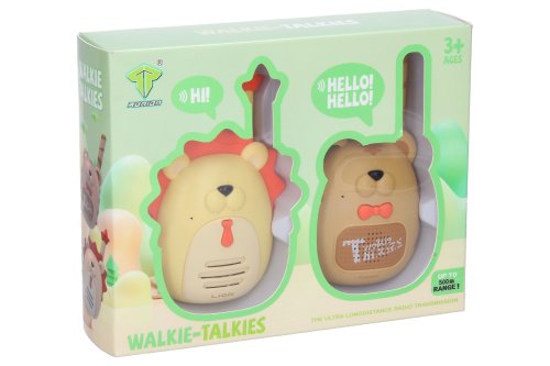Vysílačky safari se svítilnou. Velikost 12 cm. Dosah 300 m. 6xAAA (3xAAA do každé vysílačky) nejsou součástí. Aktivace mluvení stiskem kravaty nebo motýlka. Přepínač ON/OFF na zadní straně. Přepínač svítilny na zadní straně.