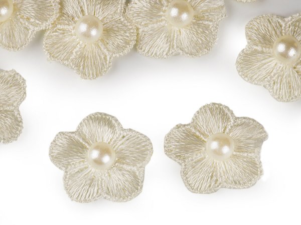 Vyšívaný květ Ø2 cm s perlou - krémová světlá (10 ks)