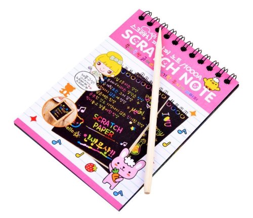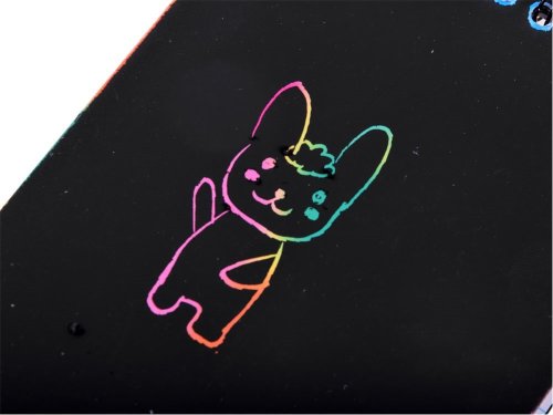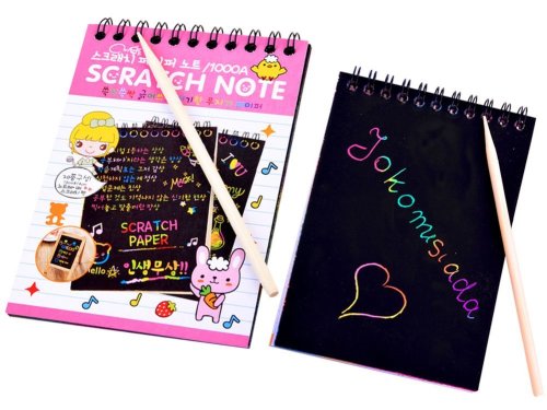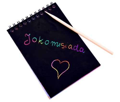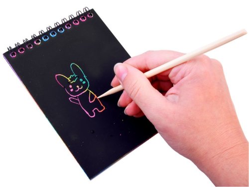 Zápisník s černými stránkami skrývá kouzelně duhové pozadí. K vytvoření obrázku, nápisu, vzkazu, blahopřání, vzoru nebo milostného dopisu postačí přiložené vyškrabávací pero. Postup: Z obrázku odstraňte ochrannou přední fólii. Přiloženým škrabacím perem vytvořte vlastní pestrobarevná díla. Balení obsahuje: