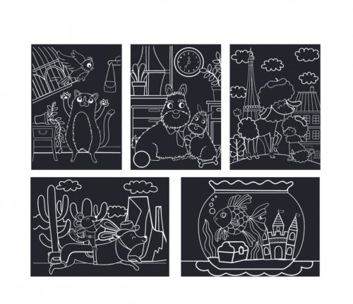 Zábavná kreativní sada vyškrabávacích obrázků Concorde s veselými obrázky Sada obsahuje 5 předtištěných obrázků s motivem mazlíčků, z toho dva zářivě perleťové Pomocí přiloženého dřevěného škrabátka …