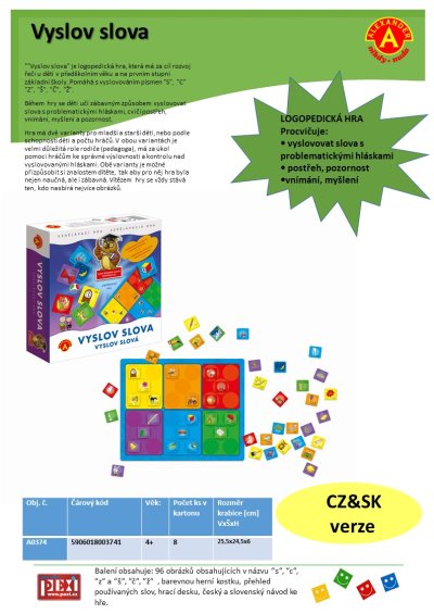 "Vyslov slova" je logopedická hra, která má za cíl rozvoj řeči u dětí v předškolním věku a na prvním stupni základní školy. Pomáhá s vyslovováním písmen "S”, "C” "Z”, "Š", "Č", "Ž".Během hry se děti učí zábavným způsobem vyslovovat slova s problematickými hláskami, cvičí postřeh, vnímání, myšlení a pozornost.Hra má dvě varianty pro mladší a starší děti, nebo podle schopností dětí a počtu hráčů. V obou variantách je velmi důležitá role rodiče (pedagoga), má za úkol pomoci hráčům ke správné výslovnosti a kontrolu nad vyslovovanými hláskami. Obě varianty je možné přizpůsobit si znalostem dítěte, tak aby pro něj hra byla nejen naučná, ale i zábavná. Vítězem hry se vždy stává ten, kdo nasbírá nejvíce obrázků. Balení obsahuje: 96 obrázků obsahujících v názvu “s“, “c“, “z“ a “š“, “č“, “ž“ barevnou herní kostkupřehled používaných slovhrací deskučeský a slovenský návod ke hře Hlavní vlastnosti: logopedická hra, která má za cíl rozvoj řečiprocvičuje postřeh, vnímání, myšlení a pozornost zábavná a zárověň naučná Dokumentace: návod ke hře CZ,SK