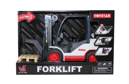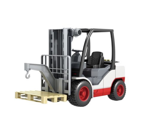 Model vysokozdvižného vozíku v měřítku 1:12 je navržen s důrazem na detail a funkčnost, což jej činí atraktivním pro děti i sběratele. Vozík má robustní konstrukci s kombinací barev bílé, červené a šedé, které věrně napodobují skutečné průmyslové stroje. Pneumatiky jsou černé s výrazným vzorkem, což podtrhuje realistický vzhled modelu. Přední vidlice jsou vybaveny malou paletou, kterou lze díky funkčnímu zvedacímu mechanismu snadno zvedat a spouštět.