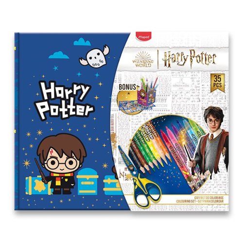 Sada obsahuje:, * 12 pastelek Harry Potter, * nůžky Harry Potter 13 cm, * 12 fixů Harry Potter, * ořezávátko, * pryž, * 2 archy samolepek Harry Potter, Rozměry boxu: 25,5 x 21 x 5 cm