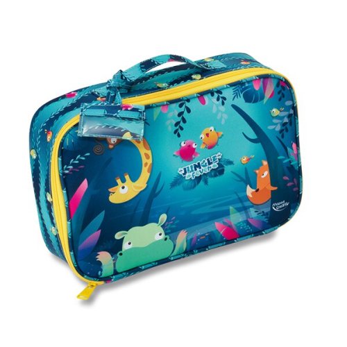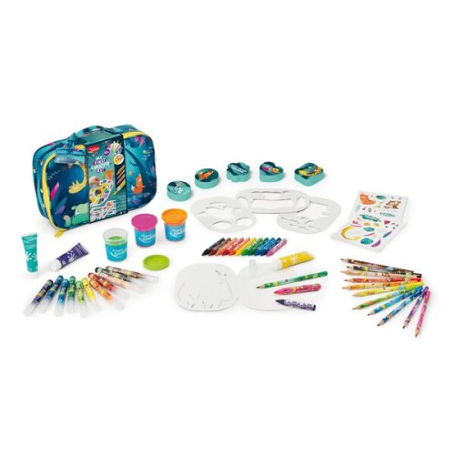 Kufřík obsahuje:, * 12 pastelek Jumbo Jungle Fever, * 12 fixů Jumbo Jungle Fever, * 12 voskovek Jumbo Jungle Fever, * 3 tuby s prstovými barvami (30 ml), * 3 kelímky s modelovací hmotou (84 g), * 5 razítek s různými motivy, * 2 archy samolepek, * 4 šablony s různými motivy, * papírový ubrus pro čistou tvorbu