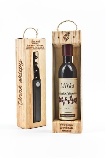 Vývrtka ve tvaru vinné lahve s originálním potiskem viněty je vhodným dárkem pro všechny milovníky vína. Užijte si svoji chvilku v dobré společnosti! Vývrtka s magnetem pro uchycení na lednici je balena v dárkové krabičce. Rozměr 12,5 x 3,5 x 2,5 cm.